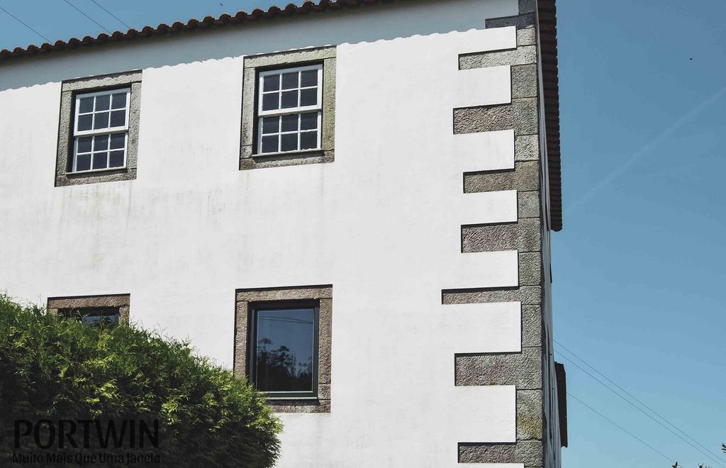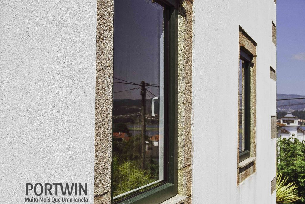Montagem FINSTRAL, série FIN 72 com folha NOVA LINE KAB. Na cor branco satinado pelo interior e pelo exterior com revestimento em Alumínio na cor verde (efeito especial).